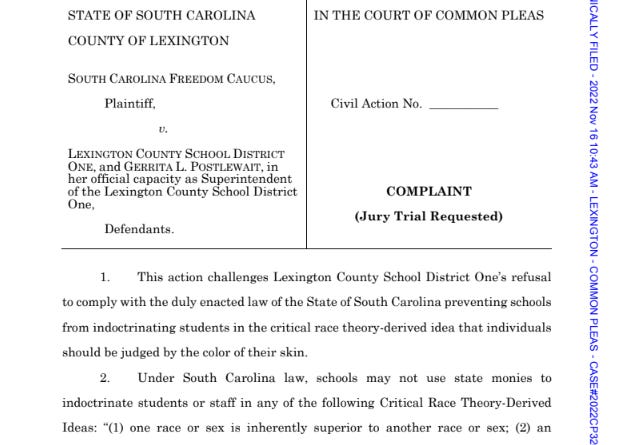 In the filed complaint, the “Freedom Caucus” (a group of far right culture-warrior legislators and their hangers-on, described in the complaint as “a legislative special interest caucus”) alleges that Lexington One somehow broke the “Partisanship Curriculum” proviso in this year’s state budget, which they claim forbids “Critical Race Theory-Derived Ideas” (that’s the actual capitalization they used, and I’m disappointed they didn’t include a trademark symbol).