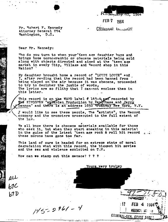 In February 1964, the FBI received a letter, forwarded from Attorney General Robert Kennedy’s office, from a concerned parent. “Who do you turn to when your ‘teen age daughter buys and brings home pornographic or obscene materials being sold along with objects directed at the ‘teen age market in every City, Village and Record shop in this Nation?” the letter begins.
