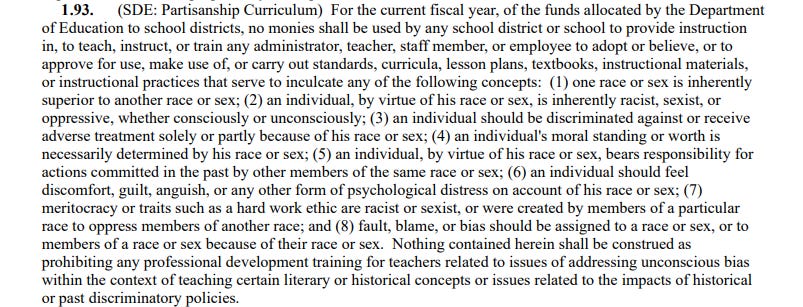 The proviso never actually uses the words “CRT” or “Critical Race Theory,” and on a literal level it has nothing to do with Critical Race Theory, at least not in the sense that any scholar would use to define the set of theories and writings that have existed under that umbrella term (coined by Kimberlé Crenshaw) since the 1970s. Instead, the language of the proviso is copied and pasted from the same Trump administration Executive Order banning diversity training requirements for federal employees on which many of these same legislators based their weird school censorship bills last session. (Crucially, lawmakers failed to pass any of these bills, so, for the second year in a row, they added the language into the budget, anyway, because most people— including many lawmakers— won’t ever read the budget, and it essentially has to pass. Democracy in action!)