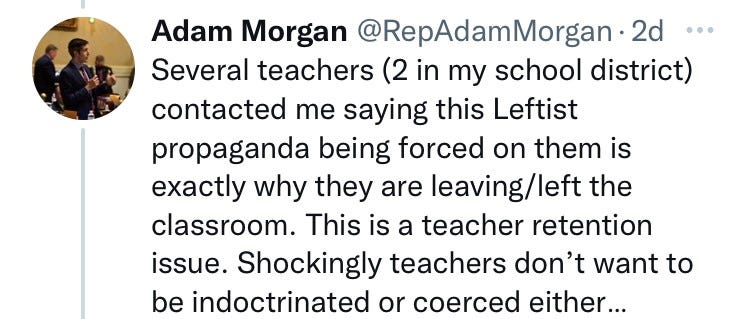 This sneaky framing allows the complaint to implicitly attribute all kinds of things to professional development held in the district without actually proving that the district or EL Education did anything to violate the proviso, which doesn’t outlaw beliefs— although I’m sure some of its proponents would love to do that if they could— but only actions taken using state funds. I pointed this out to Morgan several times; he had no substantive response.
